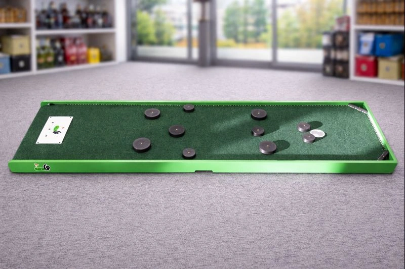 This design allows the hole to fit comfortably where space is at a premium. Putters and balls are included, making it an excellent option for venues that want interactive entertainment without reworking their layout.