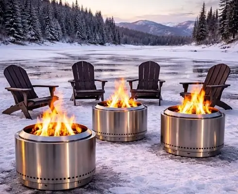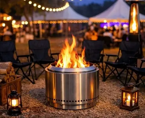 These fire pits are specifically selected for commercial and event use. The stainless-steel construction and secondary burn airflow system allow wood to burn more efficiently, resulting in bright flames with significantly reduced smoke. Similar in performance and design philosophy to premium brands such as Solo Stove and other high-end smokeless fire pit manufacturers, these units offer a professional appearance and reliable heat output. They are well suited for festivals, outdoor receptions, corporate functions, and winter or shoulder-season events where guest comfort is essential.