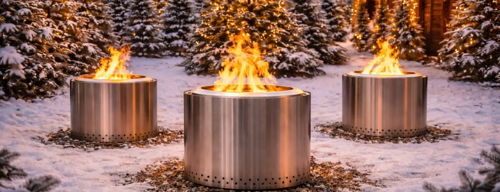 Smokeless stainless steel fire pits providing warmth at an outdoor winter event
